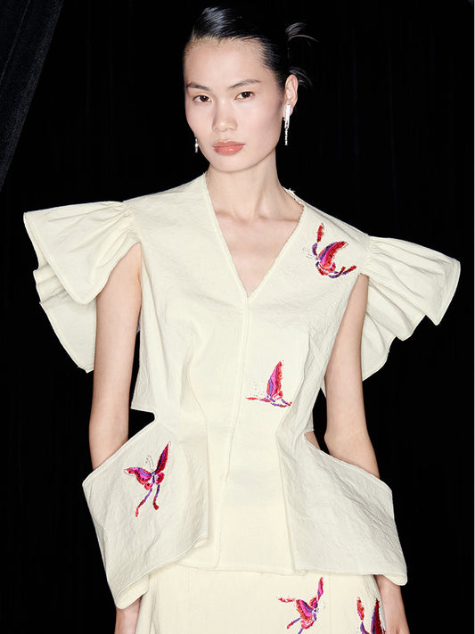 M essential Mackay designer butterfly-embroidered V-neck top skirt pants set - Amisa