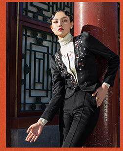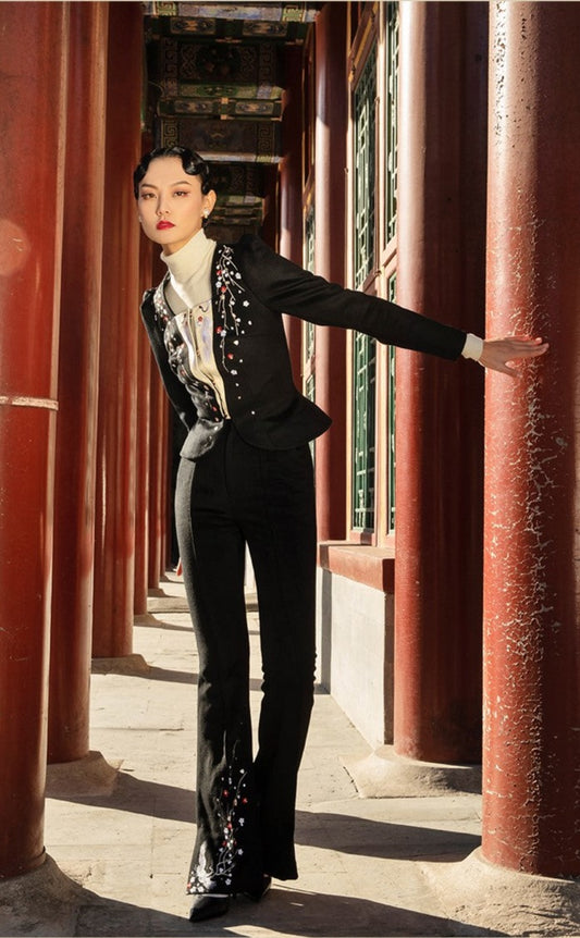 MagicQ crane plum embroidery slim wool top tweed high waist wide leg pants set - Keso