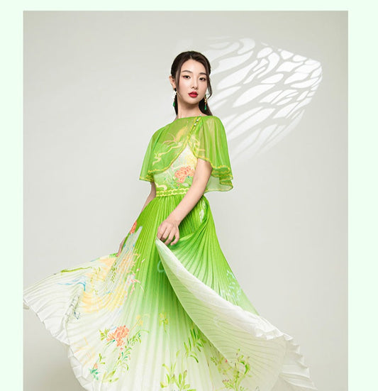 MagicQ's asymmetric placket shawl gradient willow leaf print pleated dress- Mika