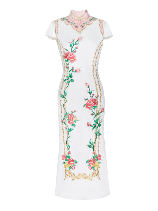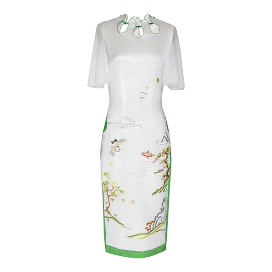 Magic Q embroidered flower drop neck panel gauze sleeves skirt - Vaielo