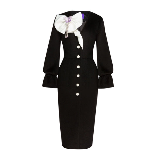MagicQ black butterfly embroidery bead string tassel bow embellished tweed coat