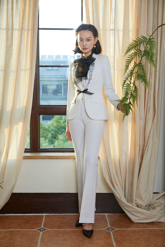 MagicQ white color-block rose embroidered collar bow tie suit horse clip wide-leg pants