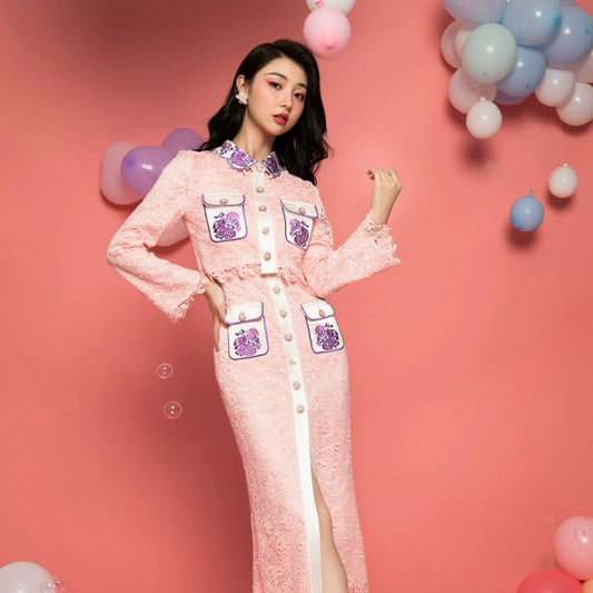 Magic Q pink rose embroidered pocket embellished lapel sleeveless lace dress jacket