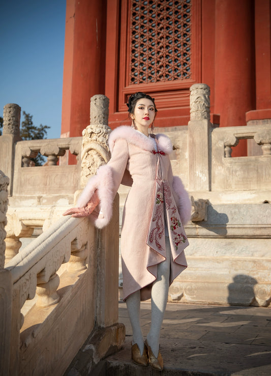 Magic Q retro irregular heavy industry peony embroidered fox fur wool coat- Vi