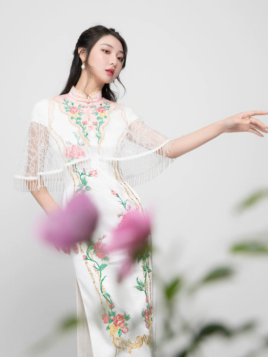 MagicQ Industries rose embroidered lace fringe shawl stand collar cloud shoulder patch embroidered beaded set
