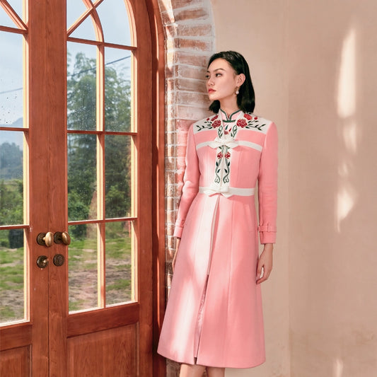 Magic Q's rose-embroidered paneled bow adjustable sleeve loop lamb wool coat