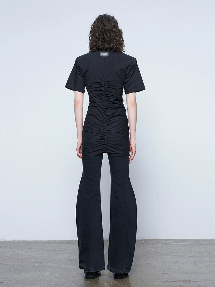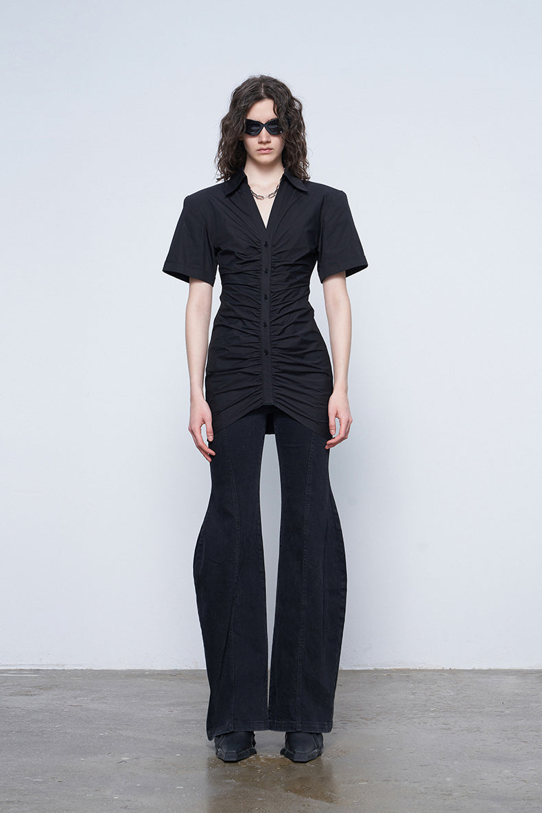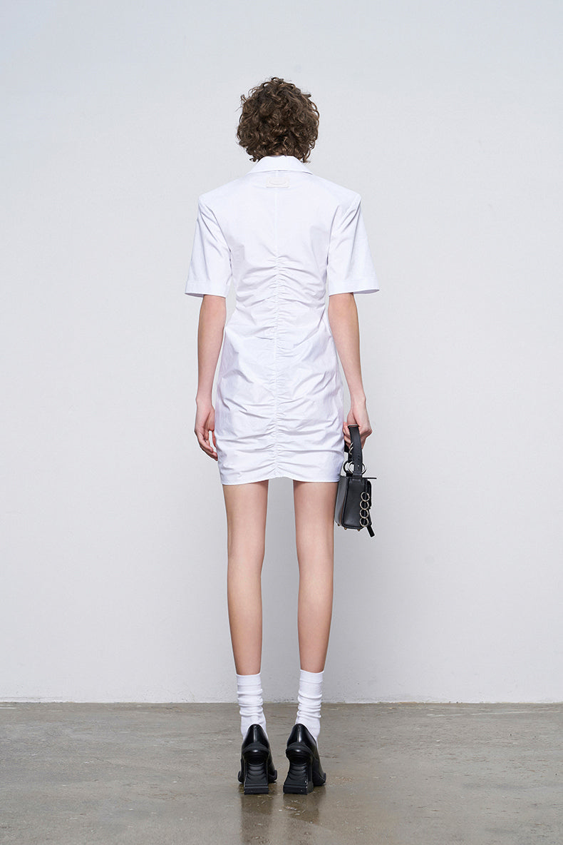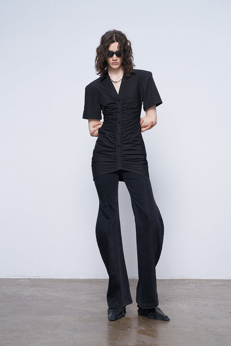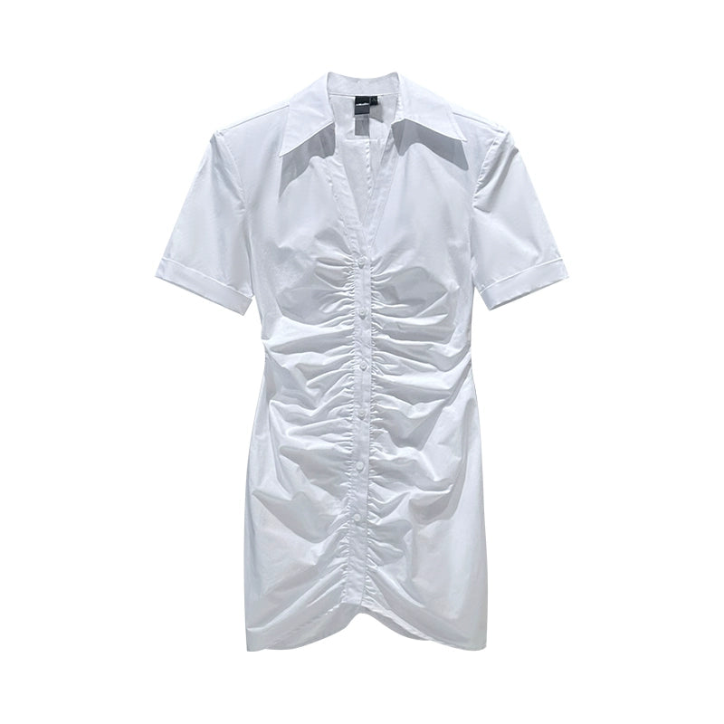 ANNAKIK Black and white pleated waist V-neck dress-FANSIA