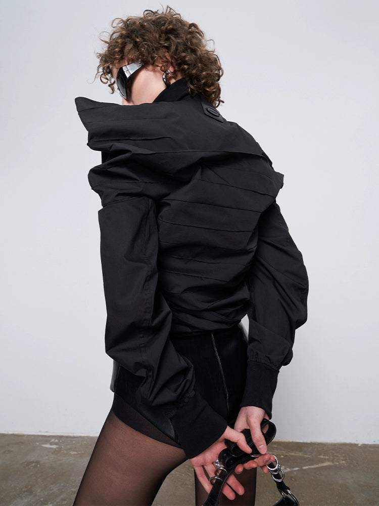 The jacket features jaw-dropping three-dimensional sleeves with intricate multi-pleating that transforms a simple silhouette into a statement piece. Cropped to perfection, it's designed for those who refuse to blend in. Whether you're layering over basics or making it the star of your outfit, this edgy essential brings drama, dimension, and undeniable cool-girl energy to your wardrobe.