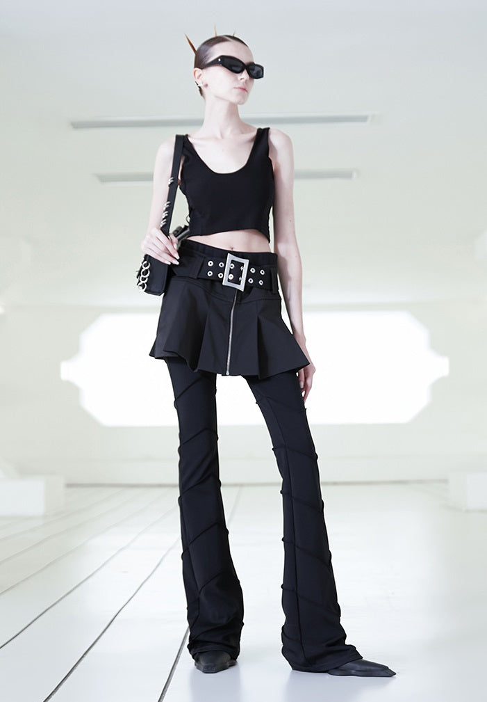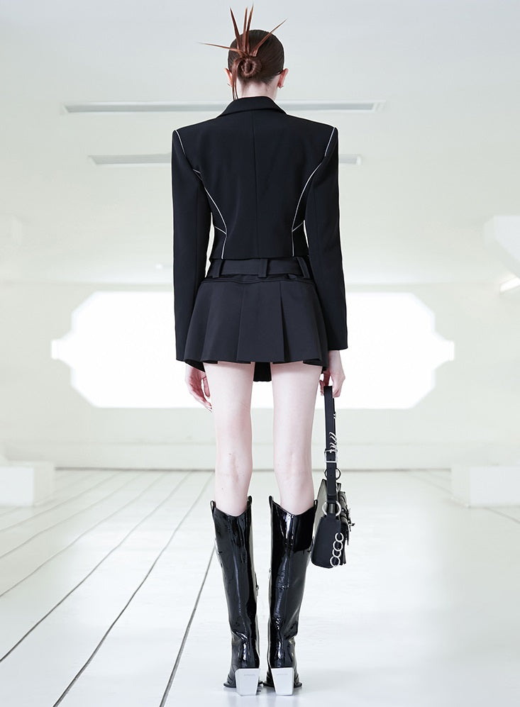 Elevate your style edge with the low-waisted black short skirt. Featuring sharp fractal pleats and bold Japanese button details, this skirt redefines modern rebellion. Its sleek silhouette and unique design command attention wherever you go. Perfect for those who dare to stand out and shape their own fashion story.