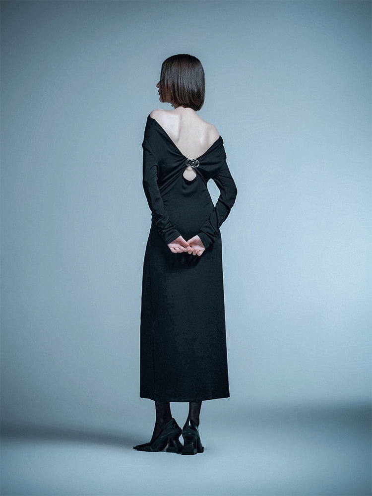 ANNAKIKI Designer Vertical Back Cut-out Pleated One-Line Neck Dress-MIU