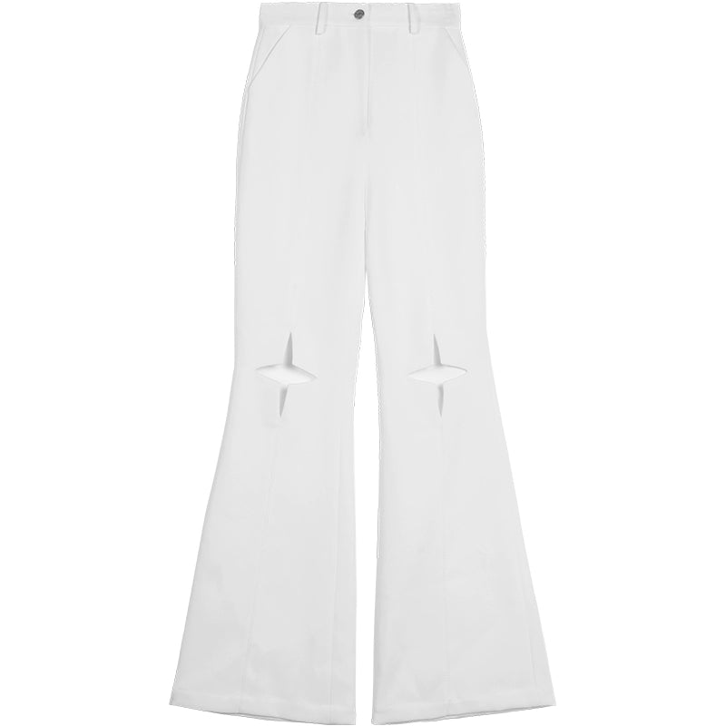 Elevate your style with white star-shaped cut-out high-waisted bootcut pants. The unique star cut-outs add a playful edge while the high waist flatters your silhouette. Designed for comfort and confidence, these pants offer a trendy bootcut fit perfect for making a bold fashion statement anywhere you go.
