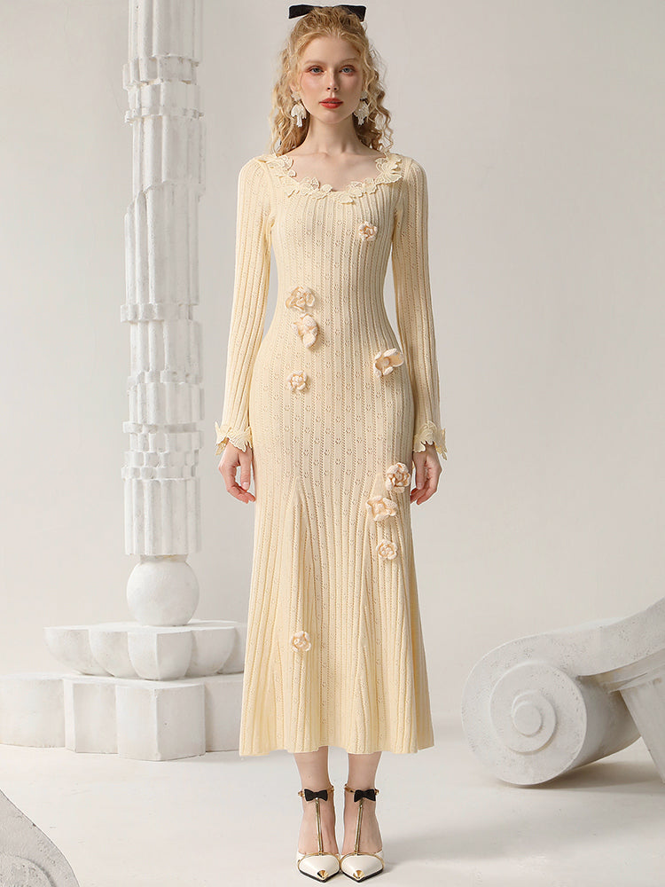 This CHECOCRE dress features a graceful scooped neckline adorned with delicate floral appliques. The long sheath silhouette transitions into a flattering fishtail flare, creating an elegant profile. Long sleeves provide warmth and sophistication, while the crochet hollow wool design offers both texture and visual interest. The slim fit accentuates your natural curves for a truly refined autumn look.