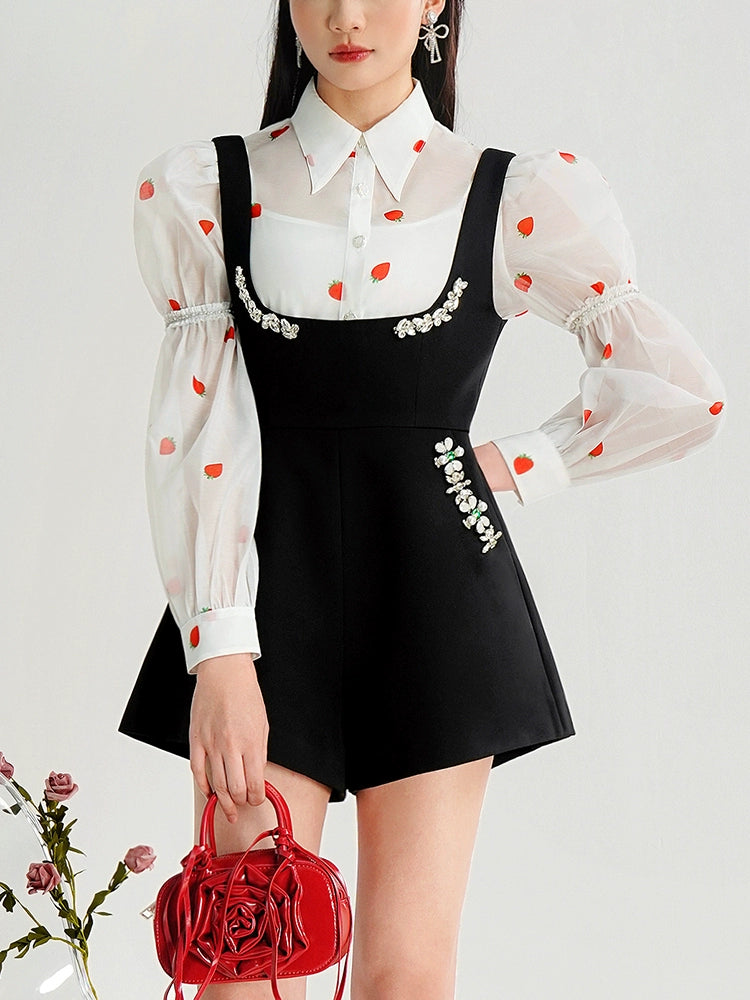 This charming three-piece set features a stylish black romper adorned with delicate white embroidery, complemented by a flowing white chiffon shirt decorated with lovely pink patterns. The strawberry print adds a playful touch to this versatile ensemble, perfect for casual outings or dressed-up occasions. Comfortable yet fashionable, this set offers multiple styling options to express your unique personality.