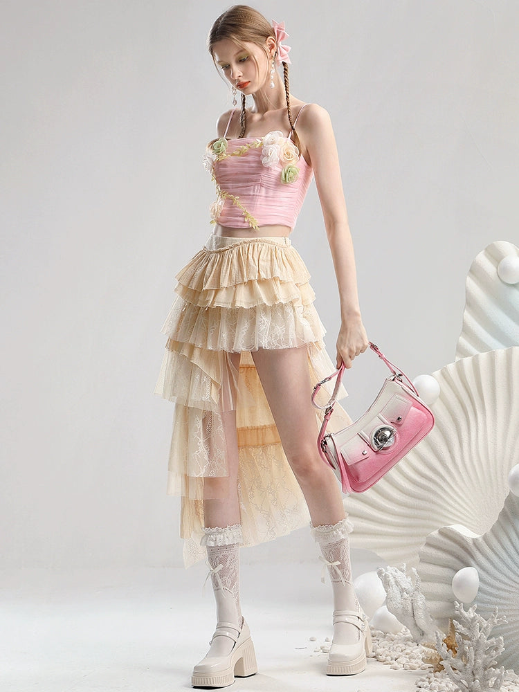 Elevate your wardrobe with the CHECOCRE Stubble Pink Three-dimensional Flower Mesh Camisole Irregular Skirt - JEREMY. This stunning two-piece set features a beige and pink color palette, spagetti straps for a feminine touch, and an asymmetrical design for a unique flair. The layered and flared skirt adds dimension and movement, making it perfect for any occasion.