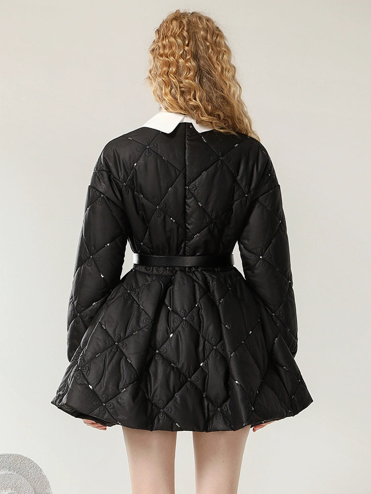 This CHECOCRE VINCE design features a sophisticated black palette enhanced with luxurious crystal and heavy industry bead flower embellishments. The distinctive doll collar creates a feminine silhouette, perfect for winter styling. The contrast elements deliver a high-fashion stubble texture that elevates any cold-weather wardrobe with elegant girl-inspired detailing.
