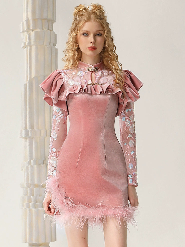 Embrace winter elegance with our CHECOCRE Cheongsam-inspired dress. This stunning pink velvet creation features delicate sequin embellishments and luxurious feather ends for a touch of glamour. The long sleeves with flared cuffs add dramatic flair while keeping you cozy. Perfect for special occasions when you want to make a lasting impression.
