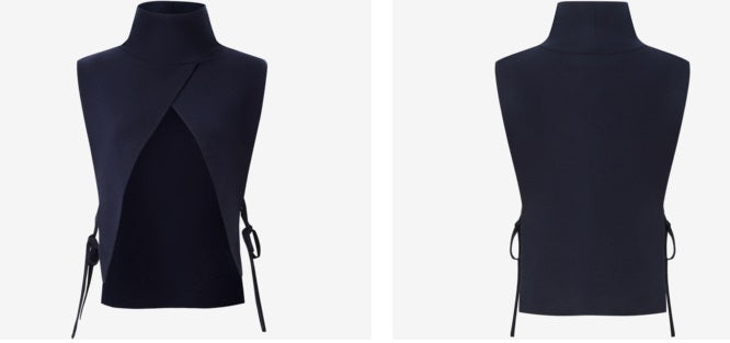 This designer wool-blend dress from COMME MOI Lu Yan offers a refined blend of style and comfort. Its high stand collar provides a modern, polished look while adding warmth. The double layered overlap front placket introduces subtle detail at the neckline, enhancing the garment's sophistication. Side waist ties thread through openings to customize the fit, accentuating the waist for a flattering silhouette. Crafted for both casual elegance and cozy wear, this knitted turtleneck shoulder piece is a versatile addition to an expert wardrobe.