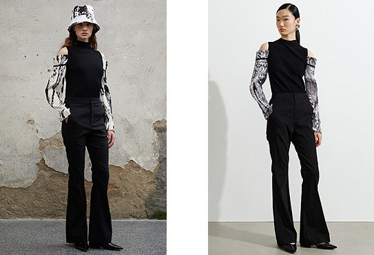 This elegant off-shoulder top by COMME MOI Lu Yan is designed to showcase the collarbone and shoulders, adding a refined touch of allure. Its carefully crafted neckline reveals skin to break dark color monotony, creating a sophisticated and captivating silhouette suitable for expert styling.