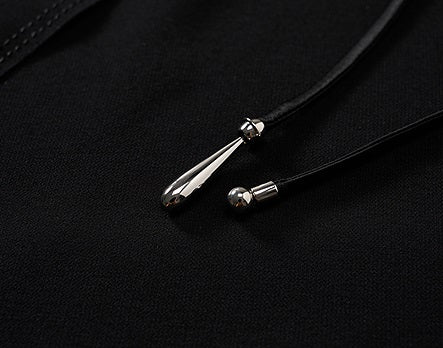 This black acetate lace skirt showcases an asymmetrical design with a delicate belt accented by a teardrop-shaped metal pendant. Crafted from a smooth, lustrous, and lightweight acetate blend, the fabric drapes gracefully for an elegant silhouette. Hidden side seam pockets add discreet practicality, combining refined detail with functional style.