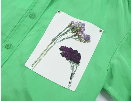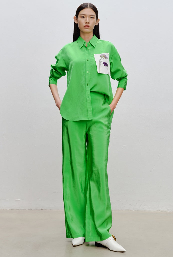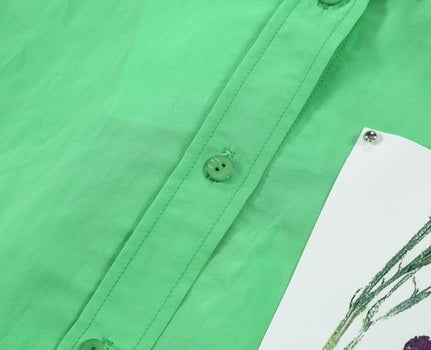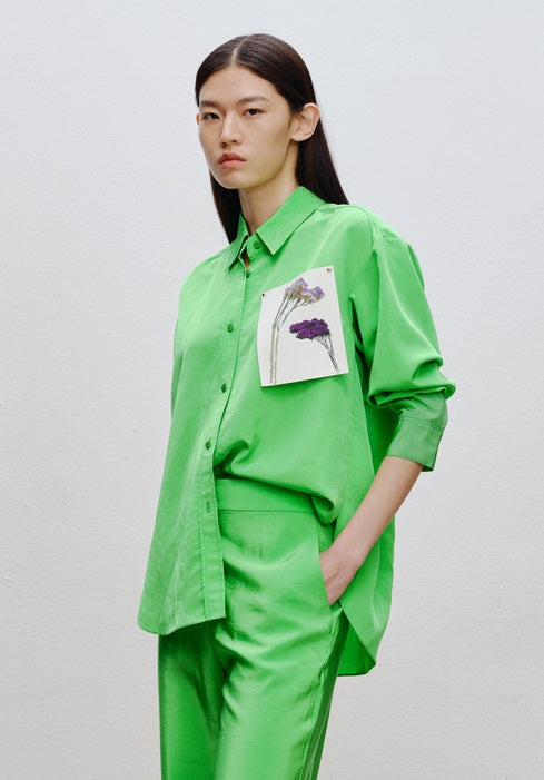 This designer women's peak-necked silhouette shirt combines a pointed collar that elegantly frames the shoulders and neck with a refined printed appliqué on the left chest patch pocket. Crafted from a rayon and polyester blend, the fabric offers a lustrous sheen and structured drape, enhancing its sophisticated profile. Toned shell buttons add a subtle yet dynamic detail, elevating the shirt’s timeless design with a modern, polished finish.