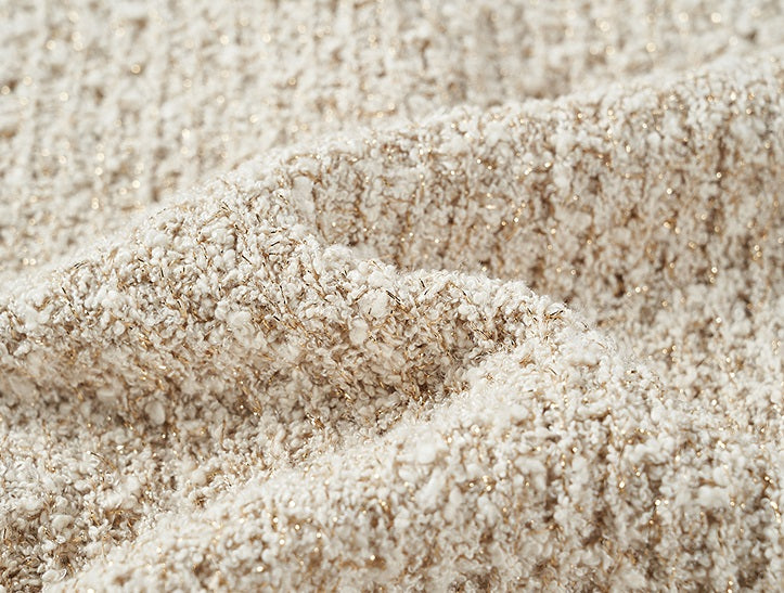 Meticulously crafted from imported Italian fancy yarn, this champagne-colored knitted vest features a sophisticated blend of metallic and looped fibers that create a rich, textured surface. The V-neck design elegantly frames the shoulders and neckline, while the taped neckline and armholes ensure a structured, crisp silhouette resistant to deformation. The three-dimensional floral pattern enhances the body’s contours, exemplifying refined craftsmanship and expert design.