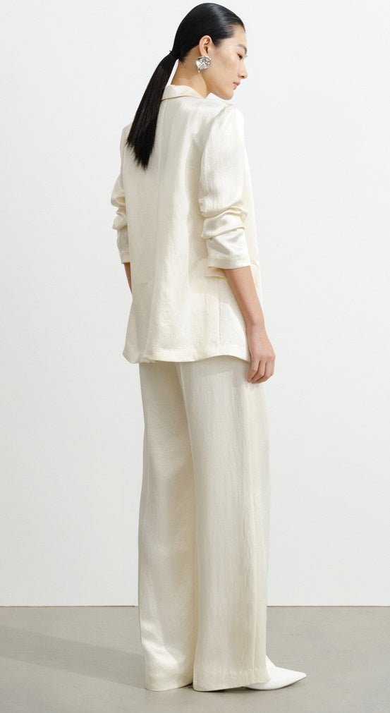 Crafted from luxurious 100% acetate, these wide-leg trousers deliver a sophisticated silhouette with an understated sheen and subtle textured surface. The breathable fabric provides a cool, skin-friendly comfort ideal for warm weather wear, while the elegant drape adapts effortlessly to your urban lifestyle. A concealed side-seam zipper ensures seamless dressing without compromising the clean aesthetic, while functional side pockets offer practical everyday convenience. The signature wide-leg cut defines the collection's modern sensibility, creating an elongated, refined line that transitions seamlessly from office to evening occasions.