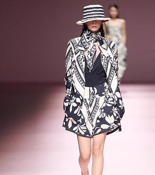 The COMME MOI Lv Yan designer summer shorts showcase a striking black and off-white print that merges delicate floral elements with bold geometric patterns, striking an effortless balance between romantic and contemporary aesthetics. A structured wide waistband sculpts the midsection while enhancing proportions for a flattering fit. Fringe detailing along the hem introduces dynamic movement and textural interest, elevating the piece beyond basic summer wear. Ideal for those seeking versatile holiday styling that combines designer sophistication with relaxed, approachable elegance.