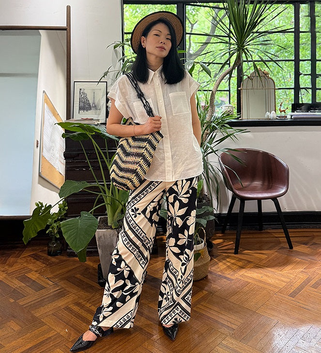 COMME MOI Lv Yan designer summer black and white printed tassel straight-leg pants - KAIN.