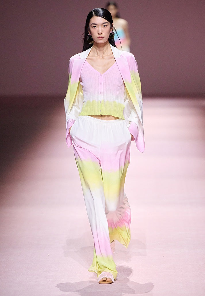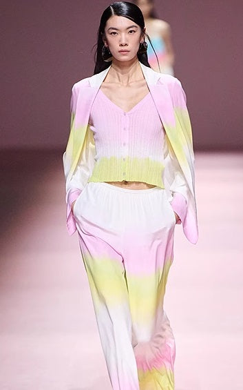 The COMME MOI Lv Yan Shyla cardigan features a fitted silhouette enhanced by an irregular rib knit pattern that contours the body while providing gentle stretch. Crafted from a cotton-nylon blend, its natural drape ensures comfortable wear without restricting movement. This gradient V-neck design combines style and functionality, making it an ideal lightweight layering piece for summer.