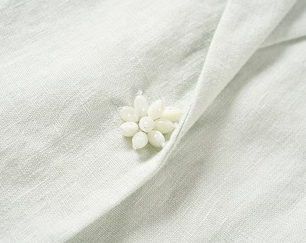 This linen blazer epitomizes understated sophistication through its refined material and considered design details. The casual notched lapel paired with flap detailing creates a relaxed, approachable silhouette that balances structure with ease—reflecting a restrained, low-key temperament ideal for contemporary styling. Hand-beaded buttons crafted from light green horse conch shells demonstrate exceptional artisanal quality, introducing subtle color variation and textural interest that elevates the placket with refined detail. Constructed from light green linen plain weave, the fabric combines natural fiber benefits with thoughtful engineering: it remains lightweight and soft while maintaining gentle drape that flatters the body. The natural linen fibers deliver a delicate texture with characteristic subtle surface variation, paired with a smooth, soft hand-feel that improves with wear. The fresh mint-green hue introduces a cooling, refreshing aesthetic particularly suited to warm climates, creating a versatile layering piece that transitions seamlessly from professional to leisure contexts while maintaining effortless elegance.