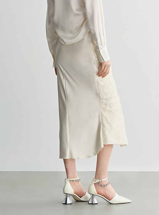 The COMME MOI Lv Yan designer asymmetrical straight skirt features a thoughtfully pleated waistband that sculpts the waist and abdomen while ensuring comfort. Its diagonal overlay panel introduces dynamic elegance, enhancing the leg line and creating graceful movement. Crafted from a blend of feather-cut fabric and triacetate satin, the skirt offers a unique textured contrast—combining the romantic softness of feather-cut material with the smooth sheen of satin for a refined summer look.