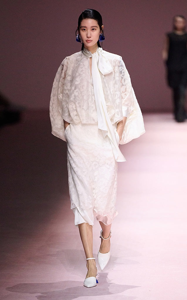 Discover understated elegance with this embroidered silk blouse, expertly designed to flatter and refine. The ribbon-trimmed V-neckline elongates the neck while its adjustable tie detail introduces a graceful, dynamic quality to your silhouette. Three-quarter sleeves provide the perfect balance flattering the arm line while offering a sophisticated, approachable aesthetic that conveys quiet confidence. Constructed from premium mulberry silk, this blouse delivers exceptional comfort through its skin-friendly, breathable properties and natural conformity to your body. The fabric remains lightweight yet maintains structural integrity, resisting wrinkles and sagging. Intricate embroidery adds dimensional beauty to the piece, making it an investment-worthy staple for those who appreciate refined craftsmanship and timeless femininity.