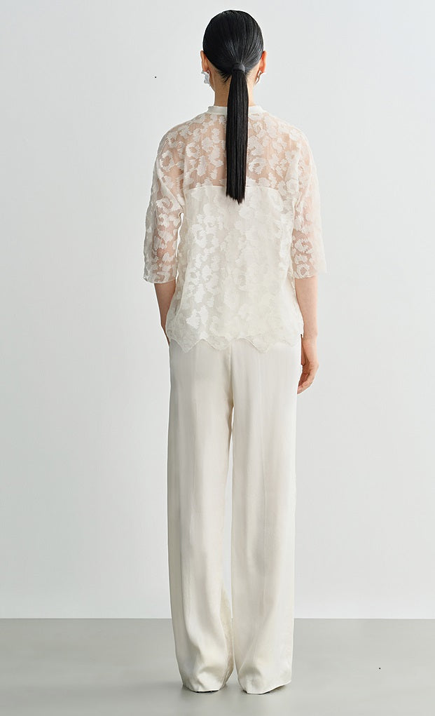 Elevate your summer wardrobe with this sophisticated embroidered silk top, crafted from premium mulberry silk that delivers exceptional breathability and skin-friendly comfort. The distinctive ribbon stand collar frames the neckline with understated elegance, while three-quarter sleeves strike the perfect balance between casual sophistication and polished refinement. Lightweight yet structurally resilient, this piece resists sagging and maintains its impeccable shape through repeated wear. The delicate embroidery detailing adds visual interest without compromising the garment's clean, sharp aesthetic. Ideal for those seeking versatile pieces that transition seamlessly from day to evening, this top combines technical fabric performance with timeless design sensibility.