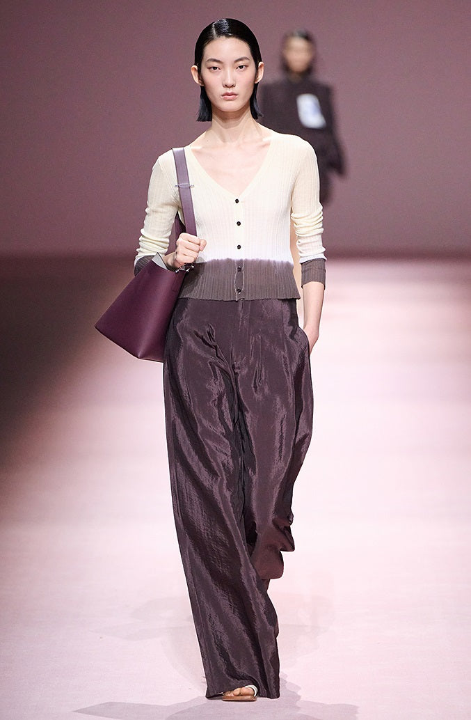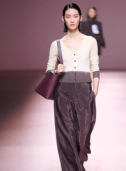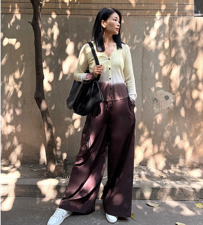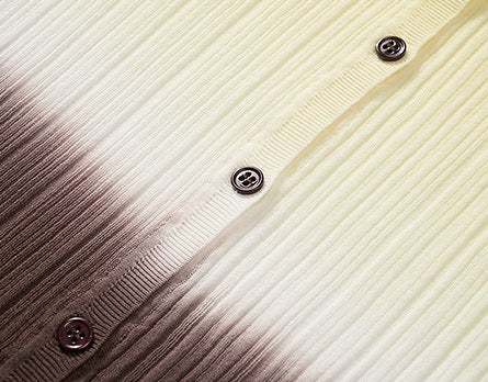 This lightweight cardigan is crafted from a cotton-nylon blend yarn that feels fine, dry, and non-clingy, making it ideal for warm weather wear. Its unique ombré gradient, achieved through a dip-dyeing technique, shifts beautifully from light yellow to white and deep brown, providing a visually striking and cooling summer palette. The darker brown at the waist subtly enhances the silhouette with a cinching effect, while the V-neck design adds an elegant touch by revealing the décolletage. Perfect for adding a sophisticated yet relaxed layer to your summer wardrobe.