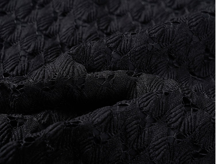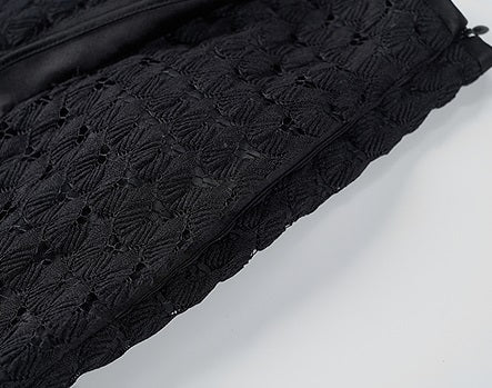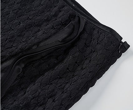 This Italian-imported skirt features a sophisticated wave-and-shell pattern created by continuously intertwined yarns, enhanced by an openwork structure and wavy knit texture that deliver pronounced depth and layering. The side slit introduces movement and lightness, while the satin waist tie adds an elegant, refined finish. Practical side pockets blend seamlessly into the design, combining functionality with style for a polished, contemporary look.