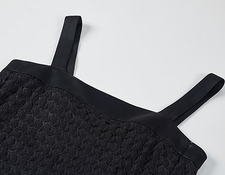 This elegant black A-line sundress from CM is crafted from imported Italian fabric featuring a clear, layered shell-like pattern. Satin trims along the straps and neckline add subtle luster and refined texture, elevating the minimalist design. The hand-finished hem preserves the fabric’s natural wavy shape, delivering a unique and dynamic silhouette that combines craftsmanship with effortless summer sophistication.