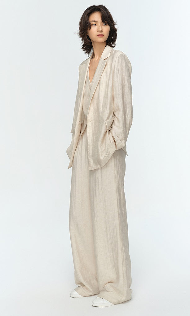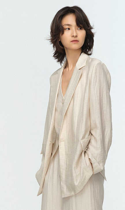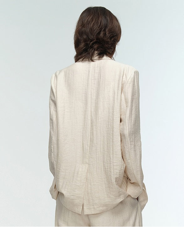 This timeless straight-fit blazer combines refined tailoring with luxurious comfort. Crafted from a premium linen blend, the fabric delivers exceptional breathability and a graceful drape that moves with your body. The interplay of natural linen slub texture and subtle satin sheen creates sophisticated visual depth—effortlessly balancing relaxed ease with polished elegance. Skin-friendly and temperature-regulating, this piece transitions seamlessly from boardroom to weekend, offering the versatility and understated luxury that defines contemporary professional style.