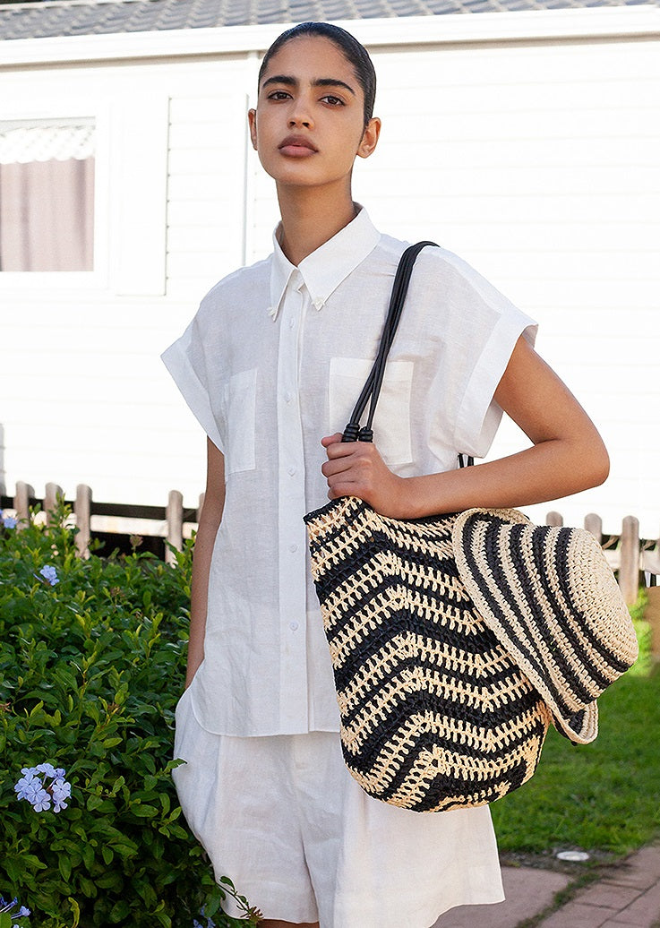 This cotton-linen blend shirt balances casual comfort with understated refinement through thoughtful design and material selection. The loose silhouette provides generous room for movement, while playful cap sleeves with naturally turned-out cuffs subtly define the shoulder line without sacrificing ease. Hand-sewn beading at the collar introduces delicate embellishment that elevates the neckline with quiet sophistication, complemented by natural shell buttons that reinforce the garment's organic aesthetic. A lightweight chest patch pocket adds practical functionality while maintaining the relaxed, approachable character of the piece. The cotton-linen blend fabric strategically combines cotton's inherent softness with linen's crisp structural integrity, creating a slightly coarse texture that embodies casual, relaxed sophistication. This material composition ensures the shirt remains breathable and comfortable in warm weather while developing authentic character through wear. The result is a versatile layering essential that effortlessly transitions from weekend casual to elevated everyday styling.