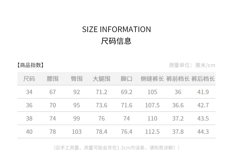 All measurements are in centimeters (cm). Please note that as measurements are taken manually, a slight variance of 1-3 cm may occur.