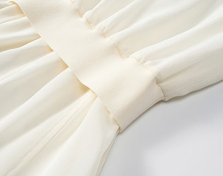 This mulberry silk dress exemplifies polished elegance through its carefully considered silhouette and refined construction details. The lapel collar with half-placket design creates a structured yet approachable neckline that balances sophistication with softness. Delicate cap sleeves provide shoulder coverage while subtly defining the shoulder line, contributing to a streamlined silhouette without sacrificing the airy, summery aesthetic essential to warm-weather dressing. A ribbed waistband cinches naturally at the narrowest point, creating gentle definition that flatters the figure while seamlessly transitioning into the lower skirt. The combination of these design elements the architectural collar, tailored sleeves, and fitted waist creates a cohesive silhouette that transcends seasonal trends. Crafted from mulberry silk, the fabric delivers inherent luxury through its soft hand-feel and natural luminosity, ensuring the dress maintains its refined appearance while providing comfortable, breathable wear throughout the day.