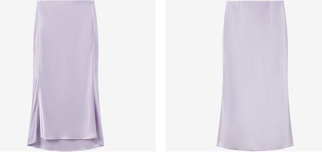 This skirt, crafted from acetate-blended double-faced satin, offers the luxurious feel and sheen of silk with exceptional softness. Its light purple hue highlights a delicate, fine sheen that enhances a feminine and gentle elegance. The double-sided satin fabric adds depth and vibrancy, while the fishtail silhouette provides a flattering, graceful shape perfect for summer wear. This designer piece by COMME MOI Lv Yan combines sophisticated texture and color to elevate any wardrobe with a refined, temperate charm.