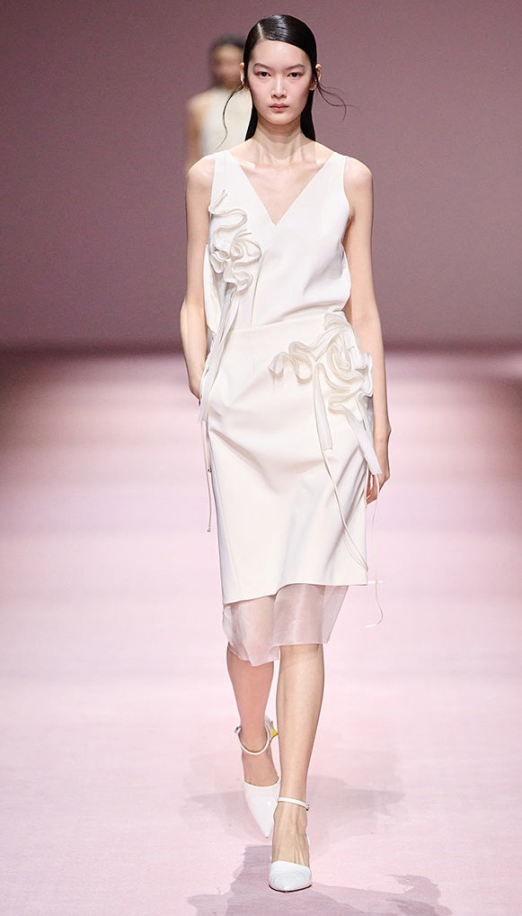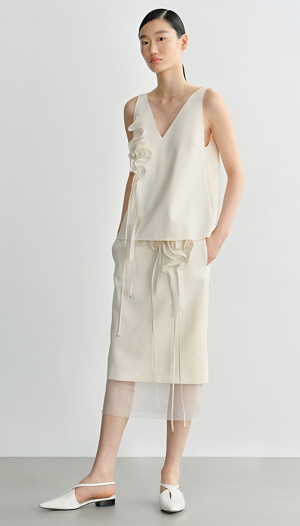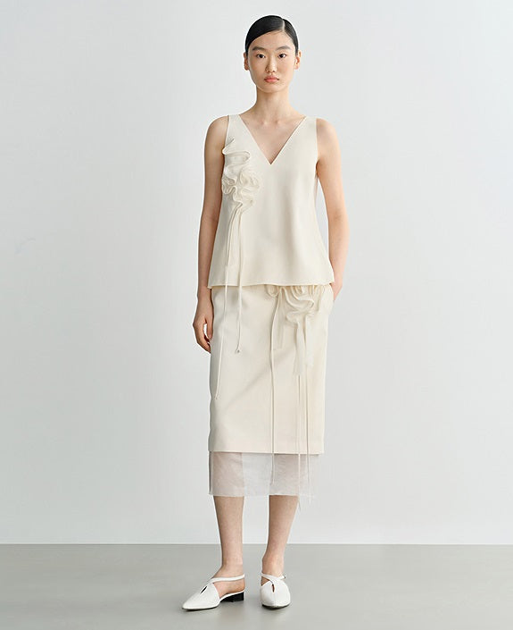 This cropped vest showcases an exquisite woven floral design that commands attention through its three-dimensional texture and sophisticated artistry. The flattering V-neckline elongates and frames the face with refined elegance, while the lightweight composite fabric provides a smooth, refined surface that complements the dimensional embellishments. The result is a piece with clean, sharp silhouettes and fluid lines—perfect for layering or wearing as a standalone statement. Ideal for warm-weather styling, this vest elevates any ensemble with understated luxury and contemporary design sensibility.