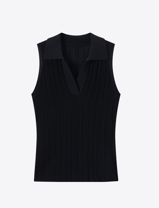 This knitted vest features a small V-neck and lapel design that introduces refined detailing and breaks visual monotony. The ribbed stitch pattern enhances its crisp structure and adds a striking three-dimensional effect. Crafted from an innovative triacetate-cotton yarn blend—comprising Xinjiang long-staple cotton fibers wrapped in triacetate filament sourced from natural softwood pulp in Canada and Alaska—this piece offers exceptional softness, durability, and breathability, making it an ideal choice for sophisticated summer wear.