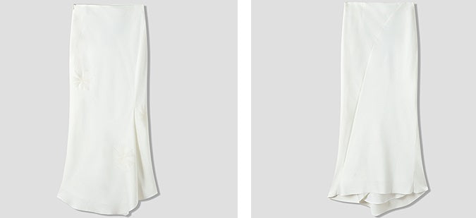 The COMME MOI Lv Yan designer fishtail skirt features exquisite firework hollow sequins embroidery that creates a dazzling burst effect, highlighting refined craftsmanship. Its strategically placed vent enhances elegance by revealing the leg line subtly while allowing ease of movement. An invisible zipper maintains a seamless look and simplifies wear. Crafted with a lustrous fabric, this three-dimensional embroidered skirt blends sculptural form with intricate detail, embodying sophisticated summer fashion.