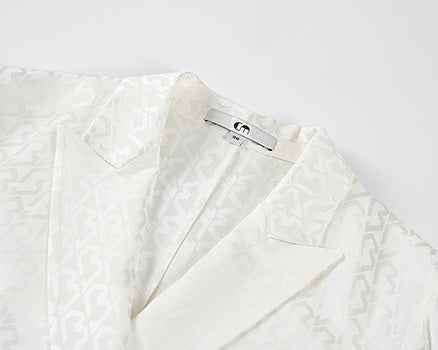 This white jacquard blazer from CM features a peaked lapel that exudes elegance and professionalism. Crafted from silky acetate-blend jacquard fabric, it offers a refined pattern and soft, comfortable drape. Practical flap pockets add depth to the design, while handmade covered buttons showcase exceptional craftsmanship, elevating the blazer’s luxurious yet understated appeal—ideal for sophisticated summer dressing.