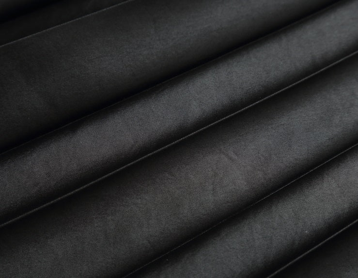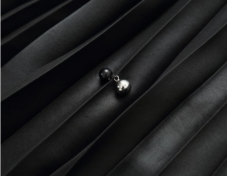 The COMME MOI Lv Yan WILLOW skirt combines double-sided satin Japanese fabric with a triacetate and polyester blend, delivering a structured silhouette with a pleated, calendered finish that resembles leather. Decorative bright silver spherical pendants and matte black rivet buttons add elegant shimmer. The PU waistband features a bright silver rectangular loop for easy adjustment, while the asymmetric hemline sculpts and flatters the legs, making this skirt a refined choice for sophisticated, contemporary wear.