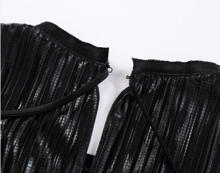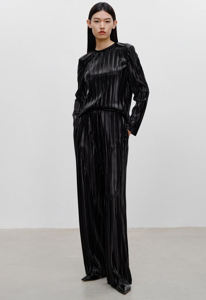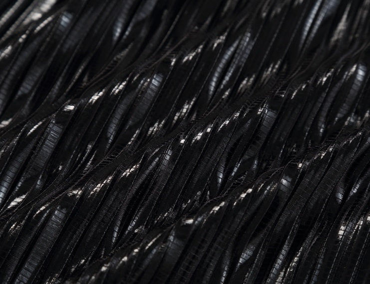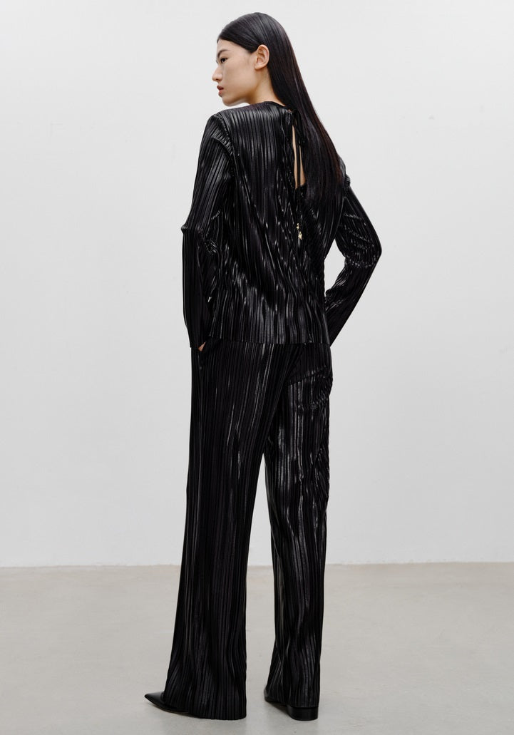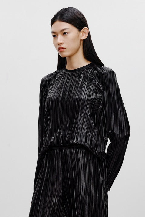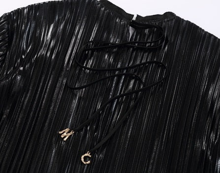 This designer women's pin-pleated crewneck top features a unique surface-coated fabric with a subtle black grid pattern that adds both visual interest and texture. Accented by CM metal hardware and a distinctive pendant, it reflects the brand’s attention to detail and casual elegance. The round neckline, enhanced with piping, highlights a refined silhouette, while the vertical back slit offers a sophisticated touch of allure—perfect for the modern commuter seeking style and comfort.