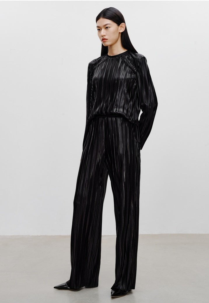 COMME MOI Lv Yan designer women's pin-pleated crewneck top commuter shirt - IVY.