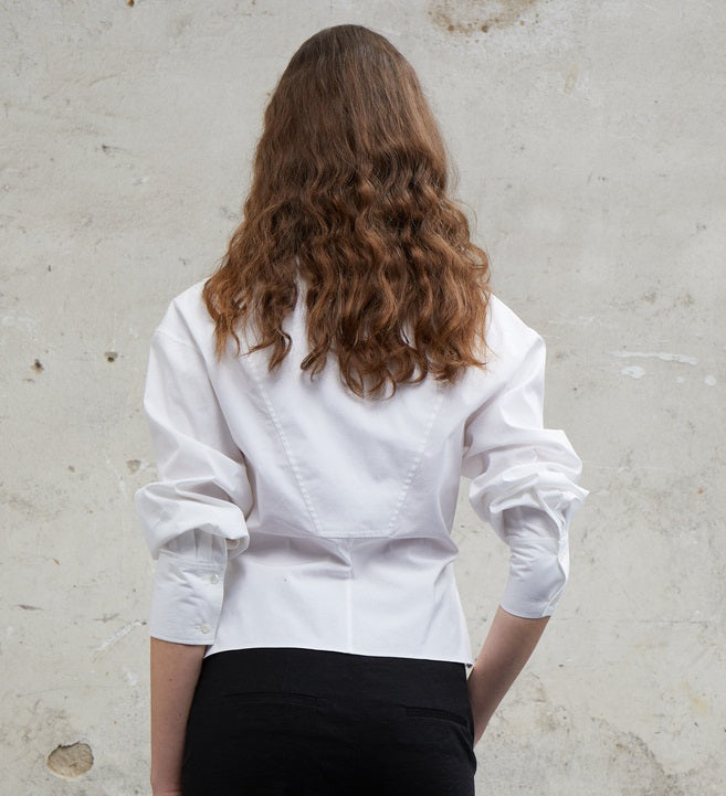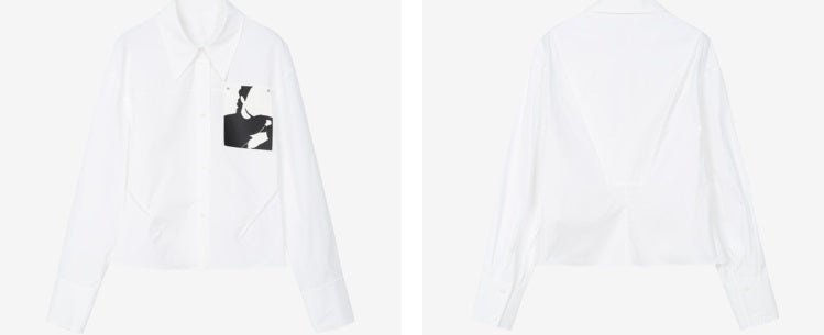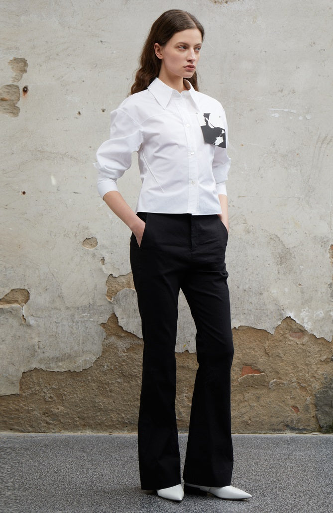 The COMME MOI Lv Yan top features a crisp white long-sleeve design with a smart waist silhouette that enhances elegance. A distinctive black and white fabric pocket detail on the chest adds a refined contrast, blending classic tailoring with subtle visual interest for a polished, versatile look.