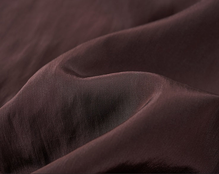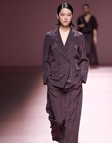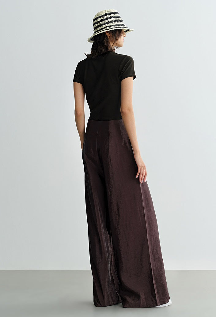 COMME MOI Lv Yan's new brown high-waisted trousers feature a pressed pleated design that flatters the waist and hips while adding dimension. Crafted from a viscose-polyester blend "Electric Light" fabric, they offer a soft, skin-friendly feel with excellent drape. The fluid wide-leg silhouette combines comfort and effortless style, perfectly sculpting the leg line for a sophisticated yet relaxed look.